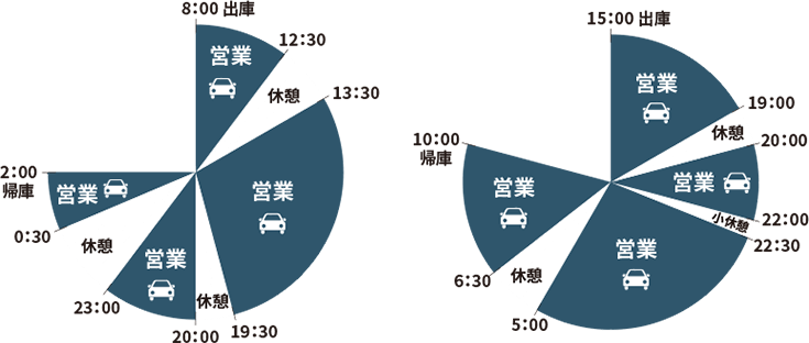就業時間 | 隔日勤務(月11~12回乗務) 8:00~翌4:00 15:00~11:00 または 日勤勤務(月22~24回乗務) 8:00~17:00のいずれか |